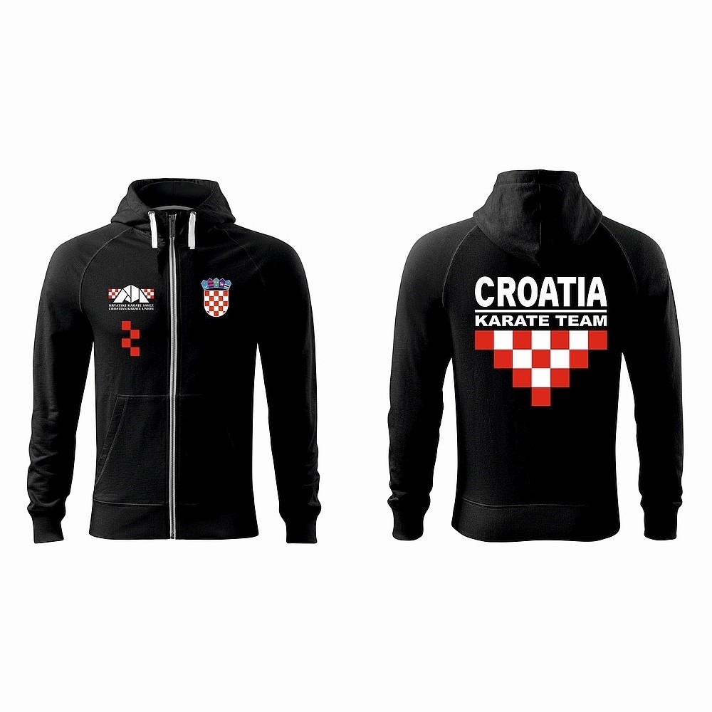 The CRO Team Karate men’s hoodie provides comfort and warmth during colder days. On the front of the black hoodie are the Croatian Karate Federation logo, the red checkerboard pattern, and the Croatian coat of arms, while the back features a large checkerboard with the recognizable inscription “CROATIA KARATE TEAM.”